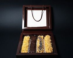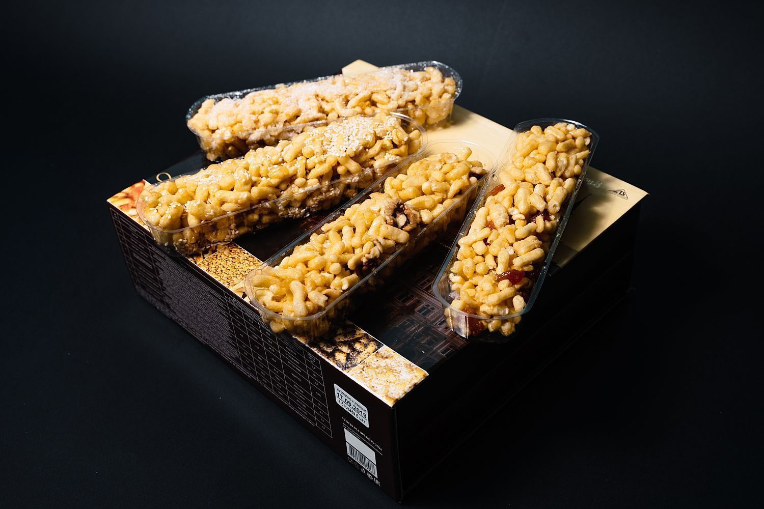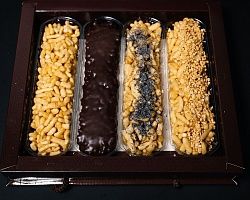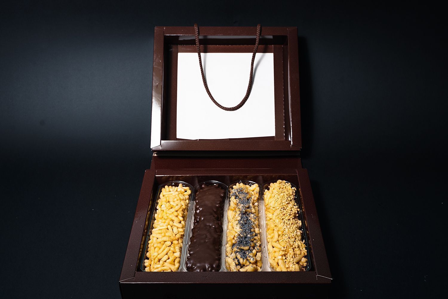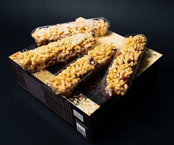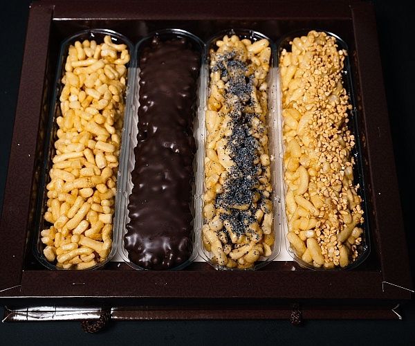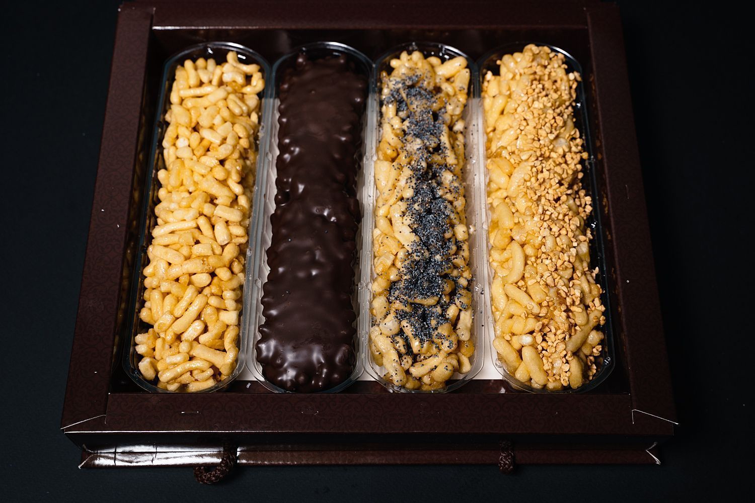 8 видов чак-чака в одной коробке: классический, с маком, с кунжутом, с кокосом, с воздушным рисом, с грецким орехом, с курагой, в шоколаде.
