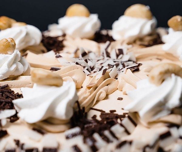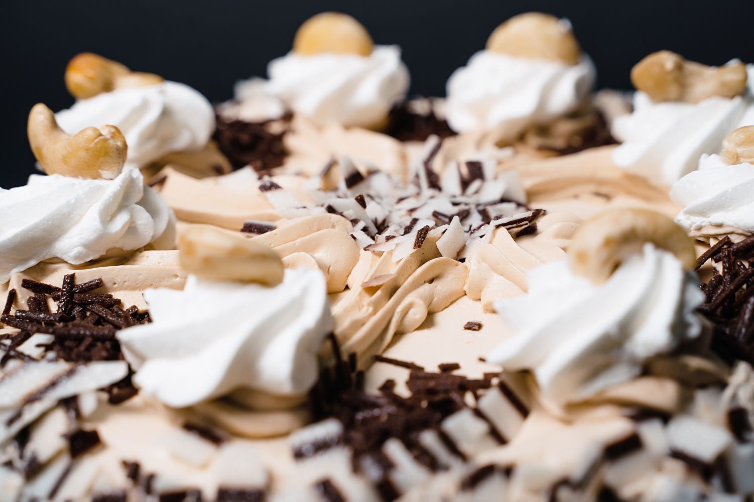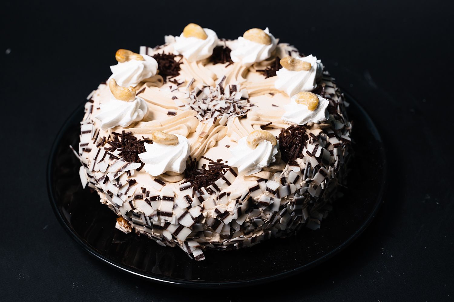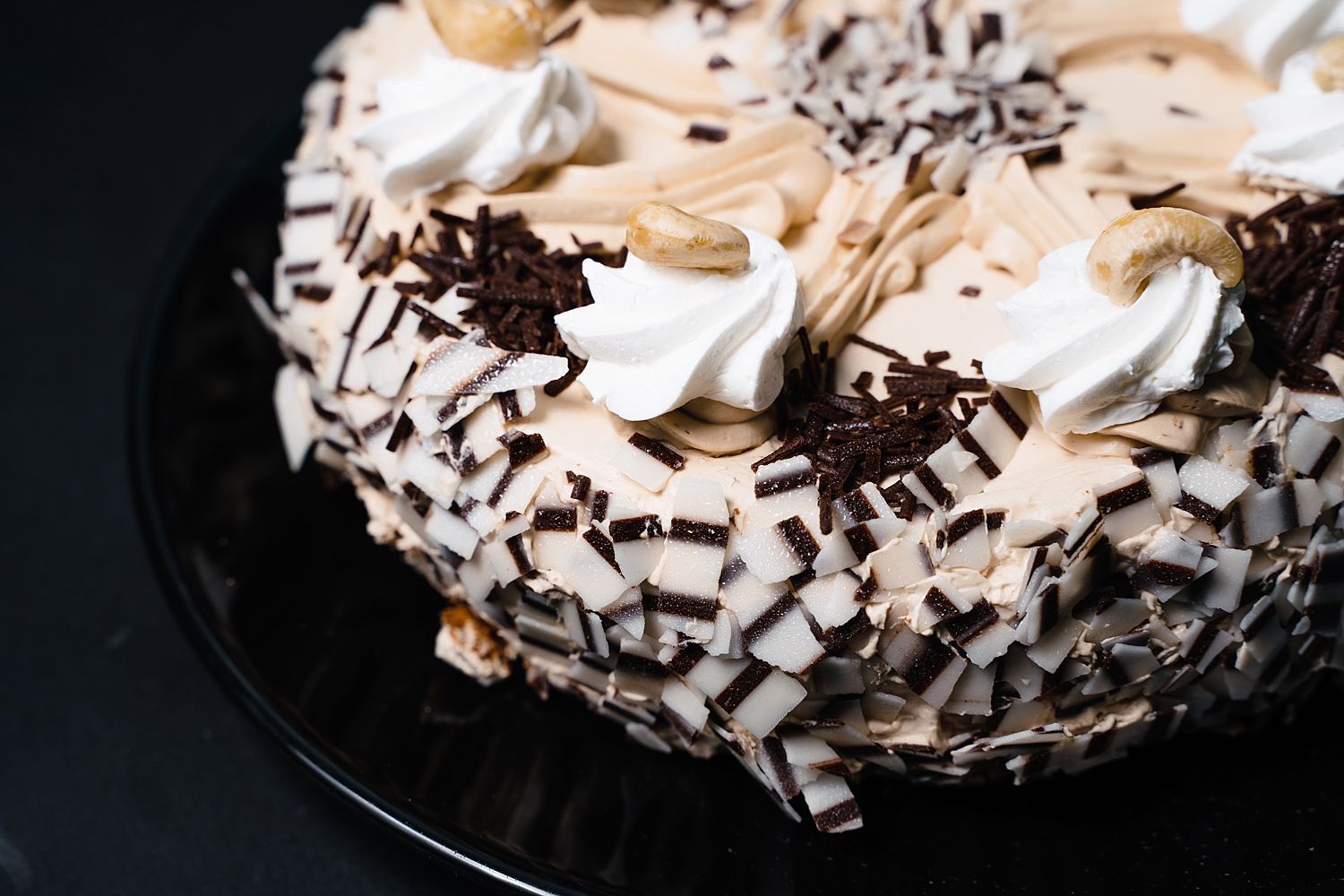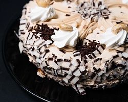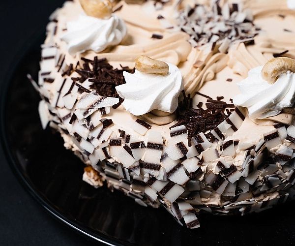 Слои нежного бисквита с какао-порошком прослоены кремом растительно-жировым, с продуктом молокосодержащим сгущенным с сахаром "Варенка". Поверхность торта покрыта этим же кремом, украшена шоколадной глазурью, шоколадной соломкой и фундуком.