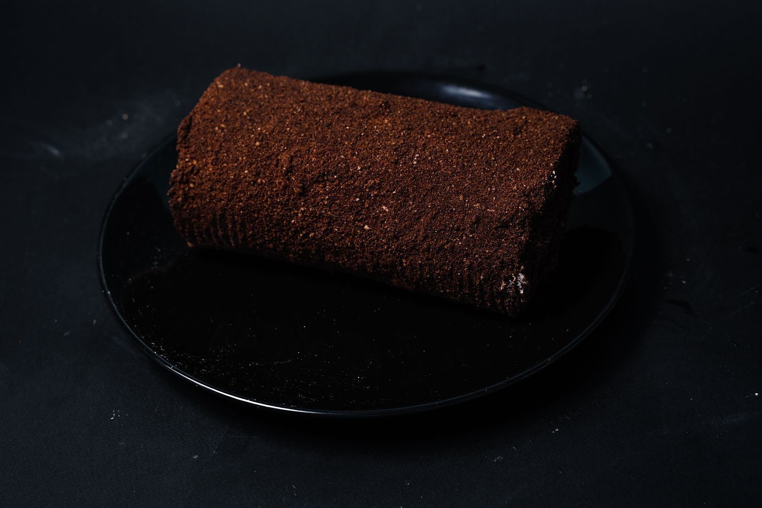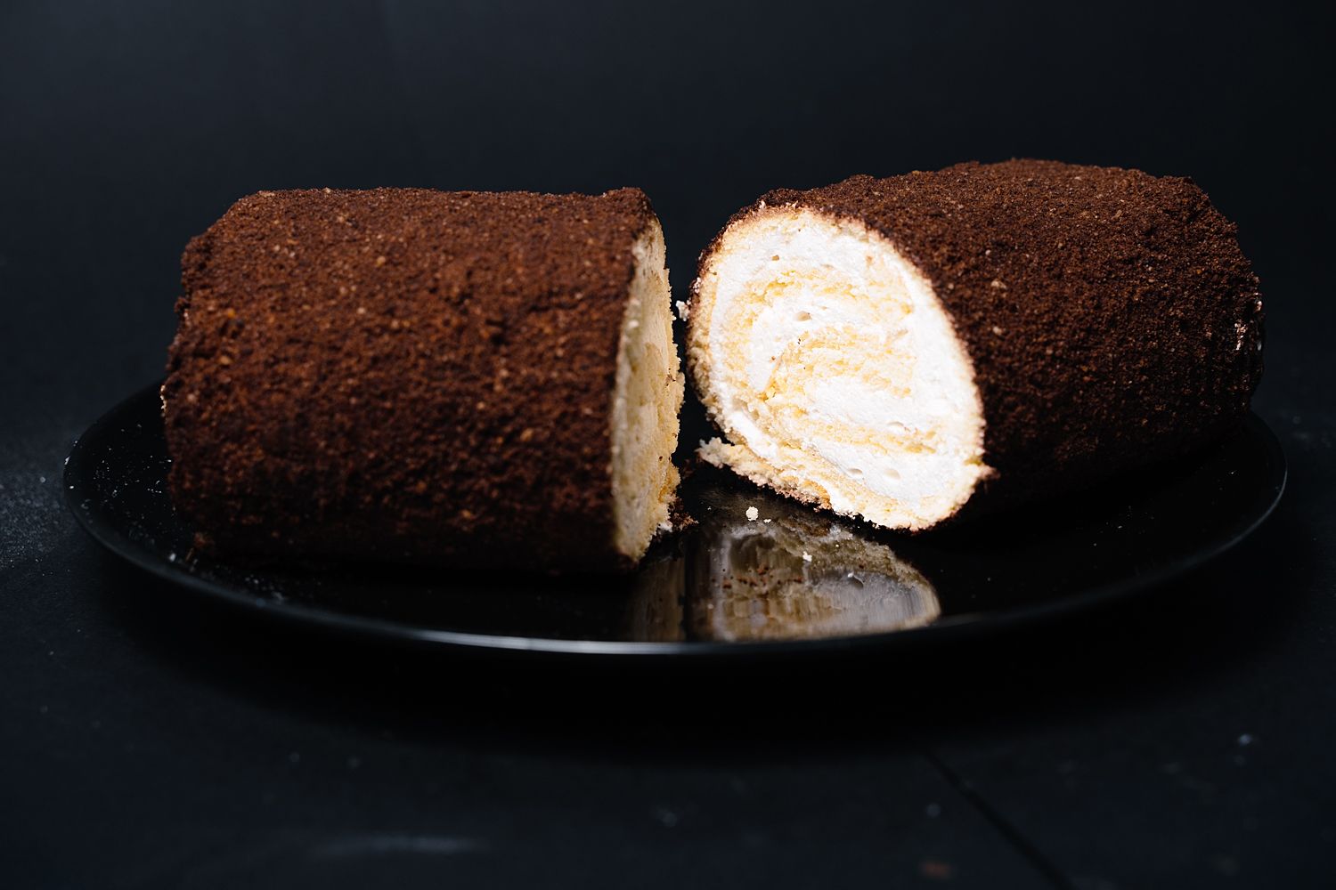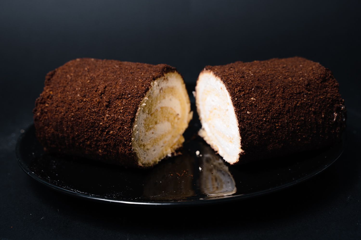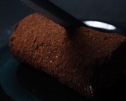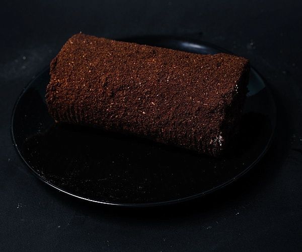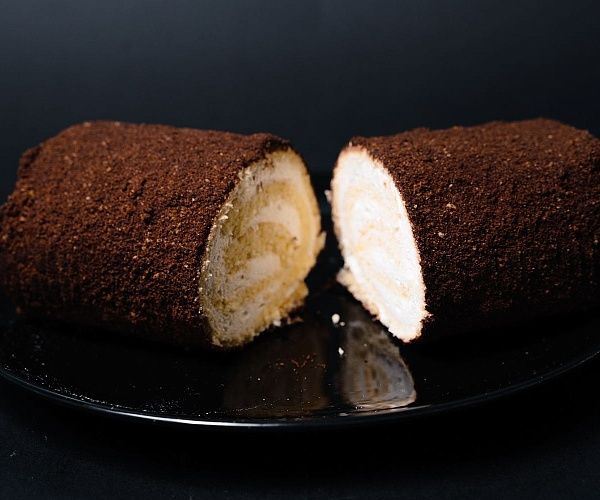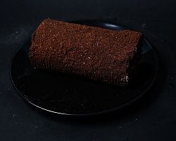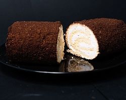 Бисквитный рулет, суфле, шоколадная крупка.