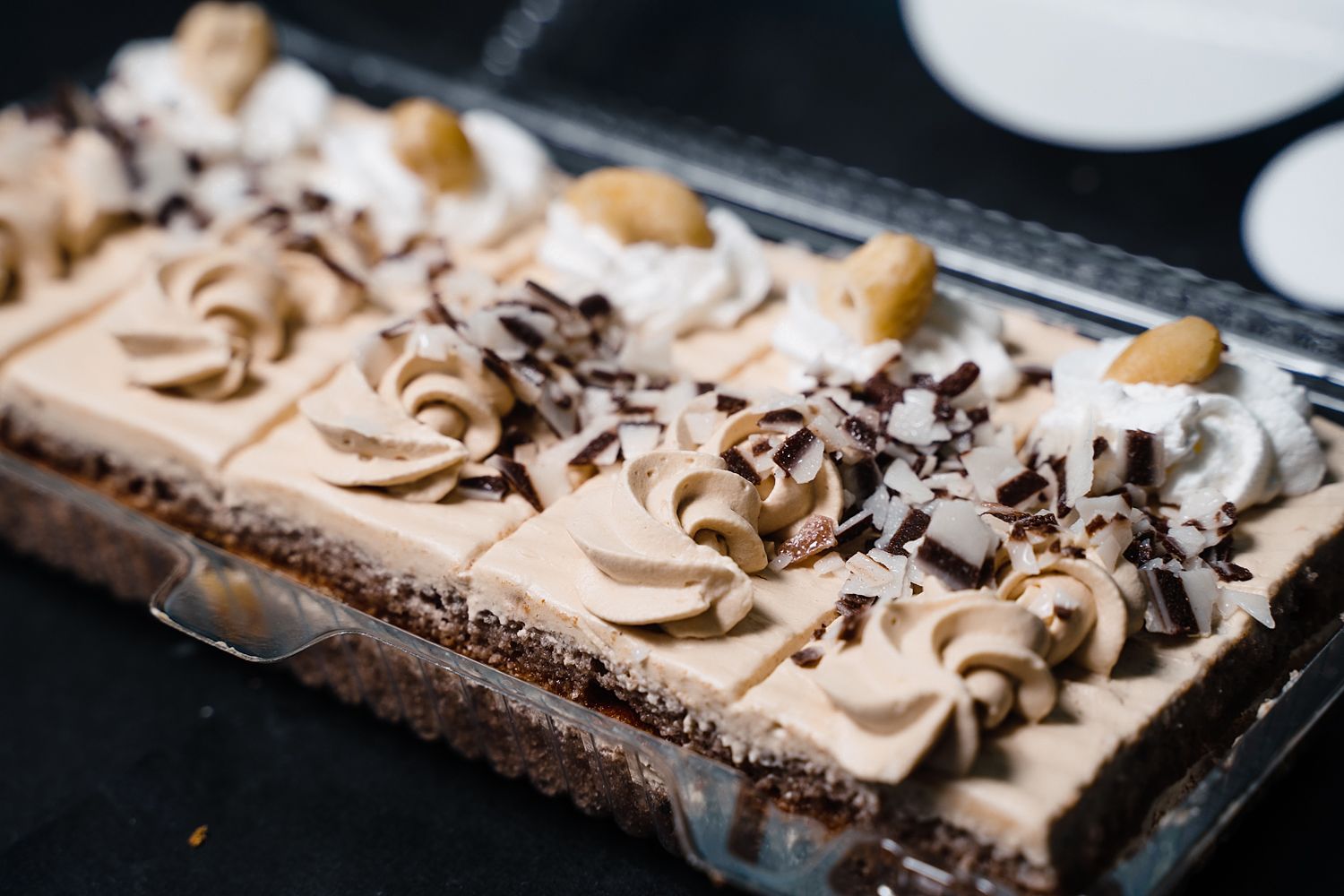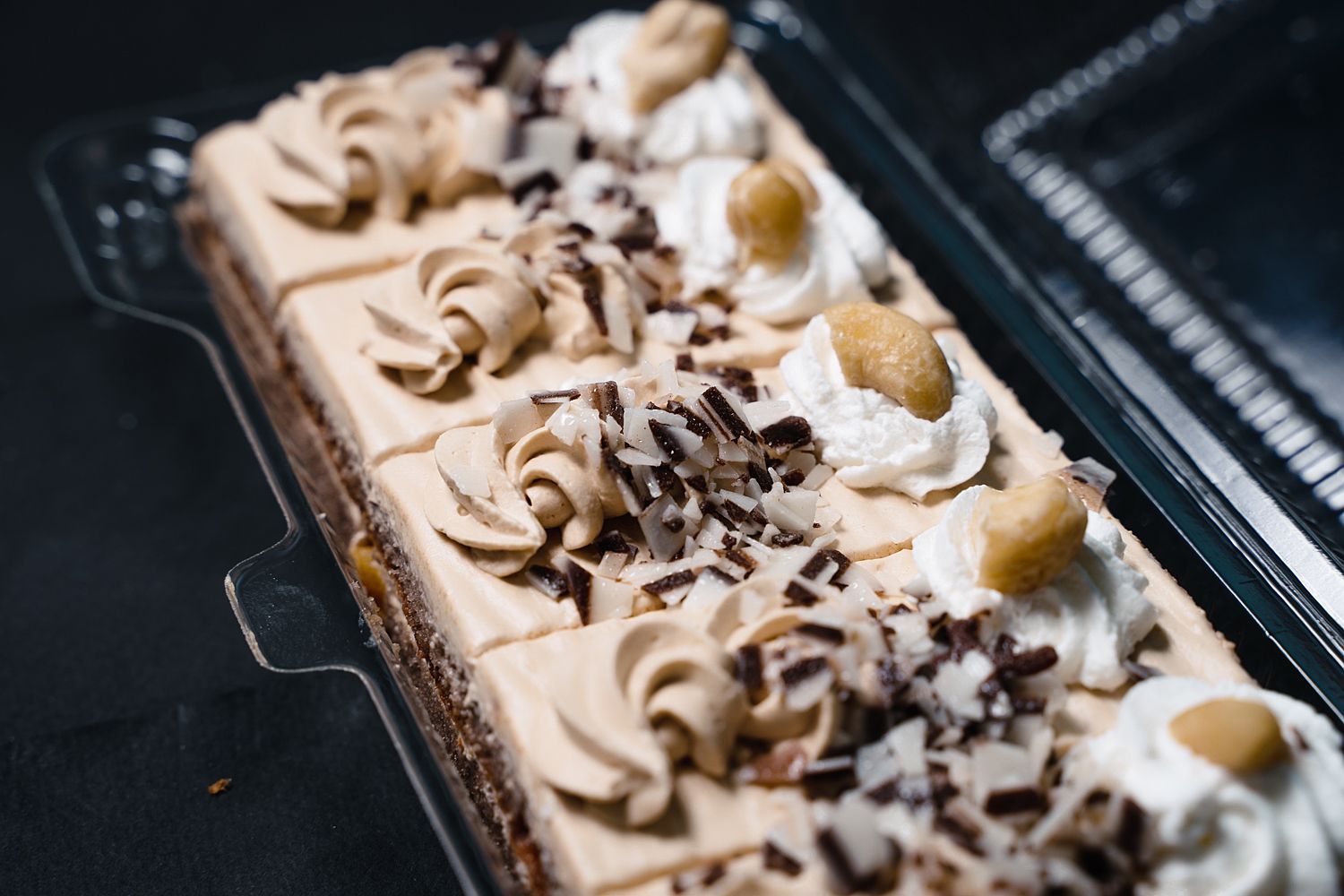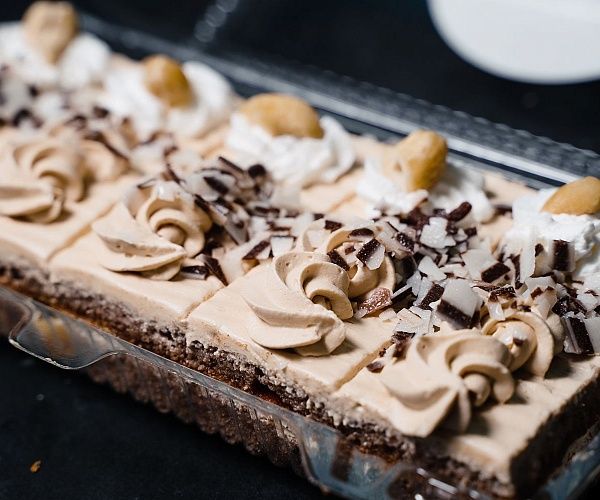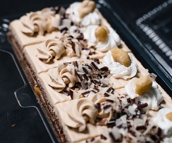 Слои нежного бисквита с какао-порошком прослоены сливками с варенной сгущенкой и курагой. Поверхность пирожного покрыта этим же кремом, шоколадной соломкой и фундуком.