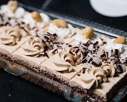 string(309) "Слои нежного бисквита с какао-порошком прослоены сливками с варенной сгущенкой и курагой. Поверхность пирожного покрыта этим же кремом, шоколадной соломкой и фундуком."