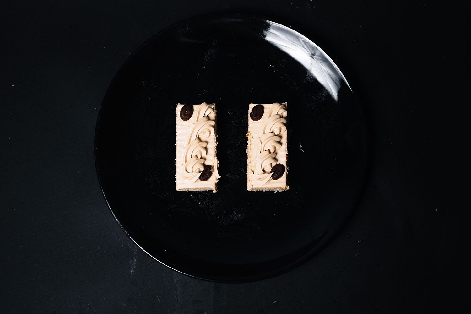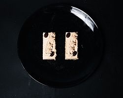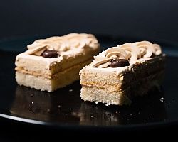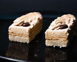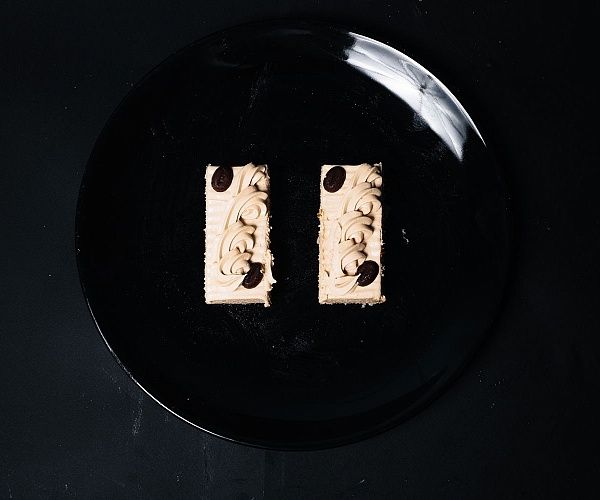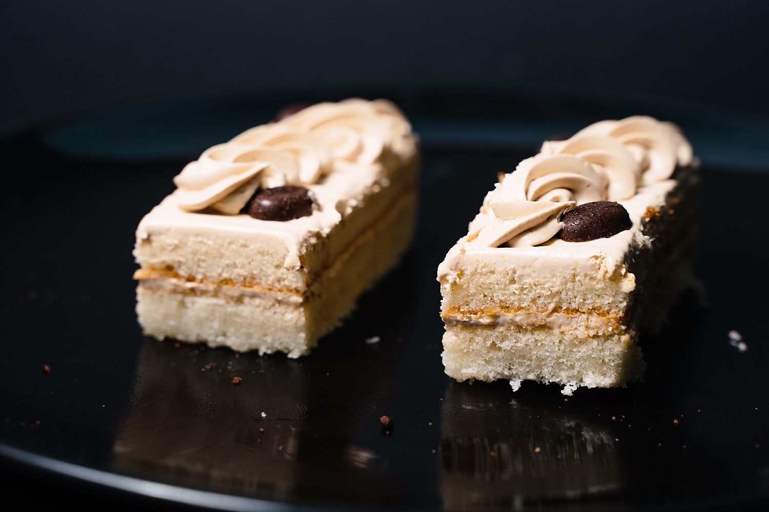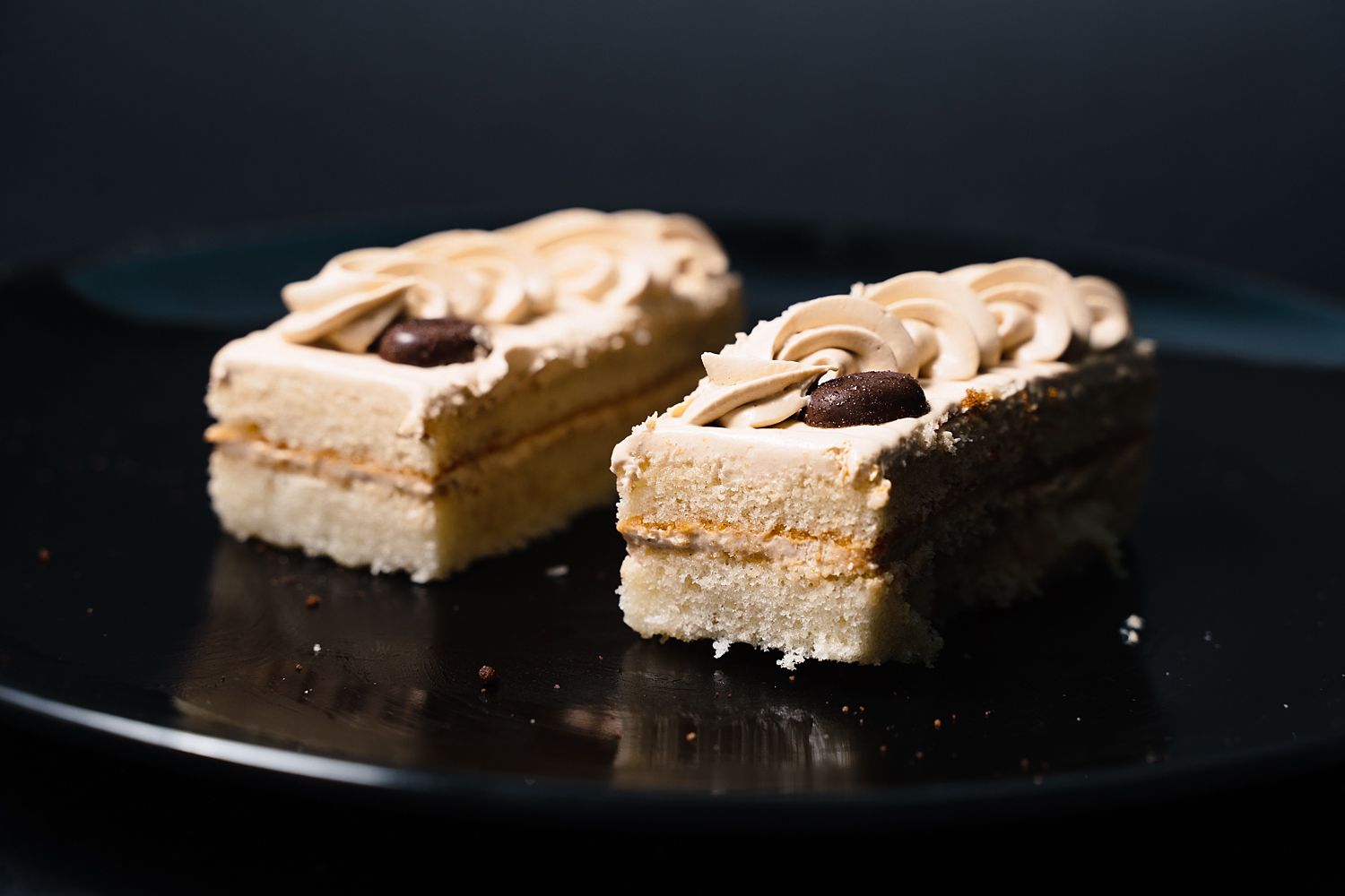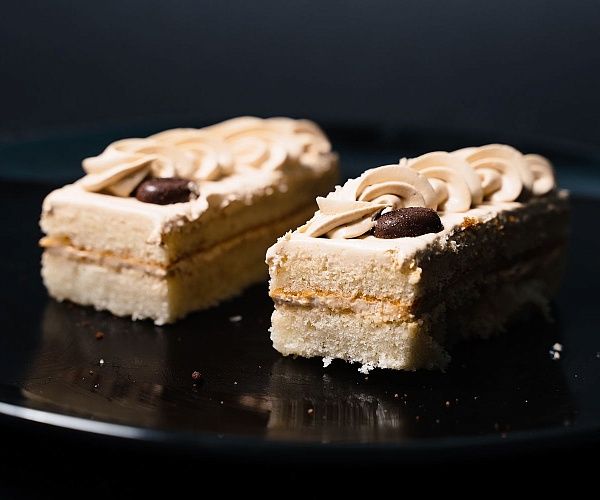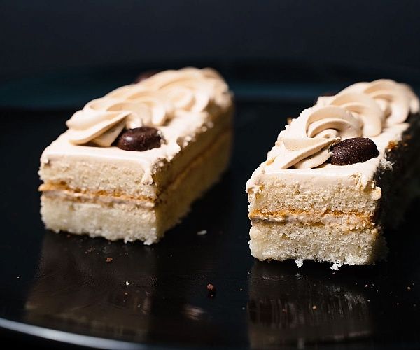 Слои бисквита пропитаны сиропом и прослоены кремом растительно-жировым с продуктом молокосодержащим сгущенным с сахаром "Варенка". Поверхность украшена этим же кремом и изделиями из шоколадной глазури.