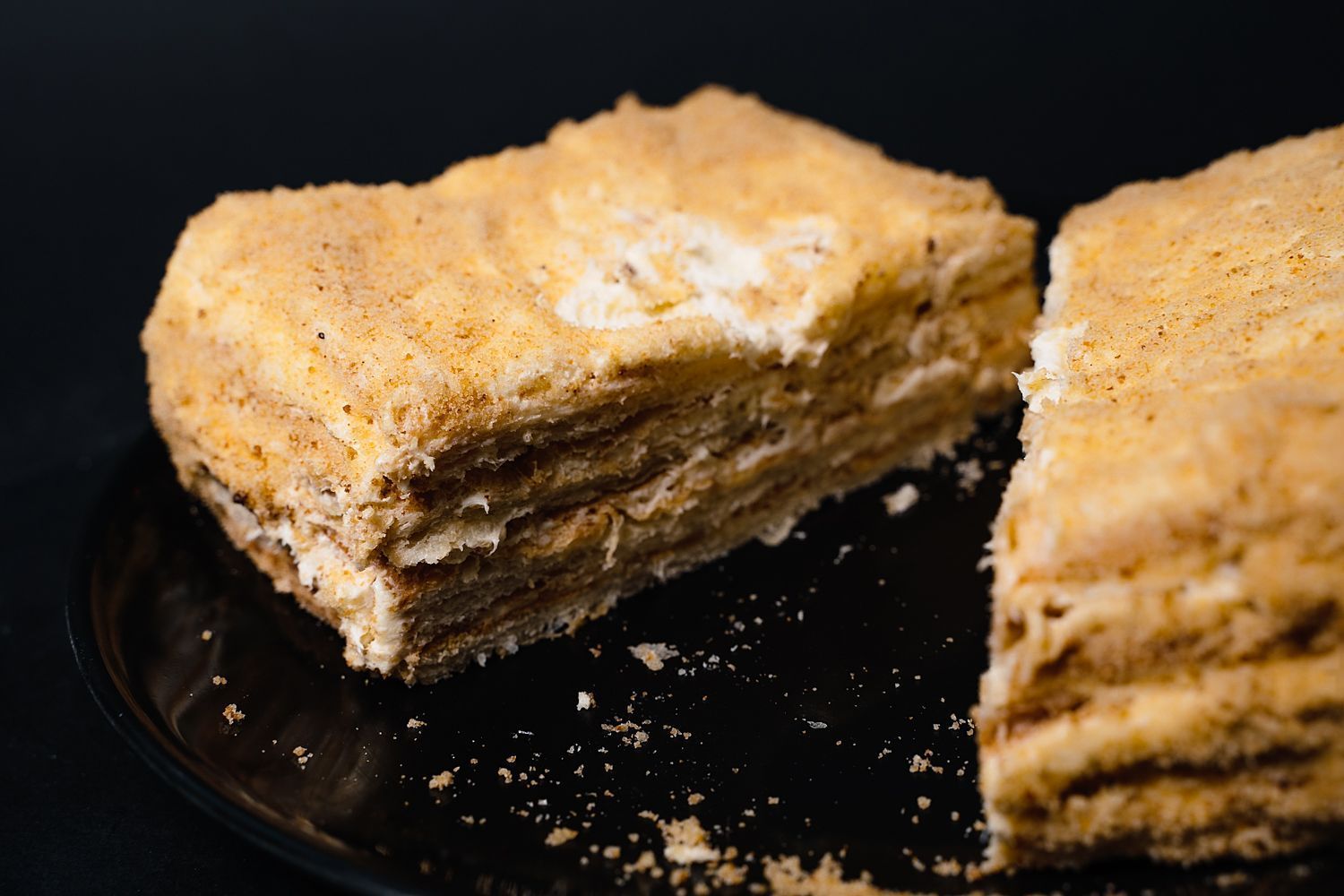 Слоеные коржи, крем сливочный со сгущенным молоком.